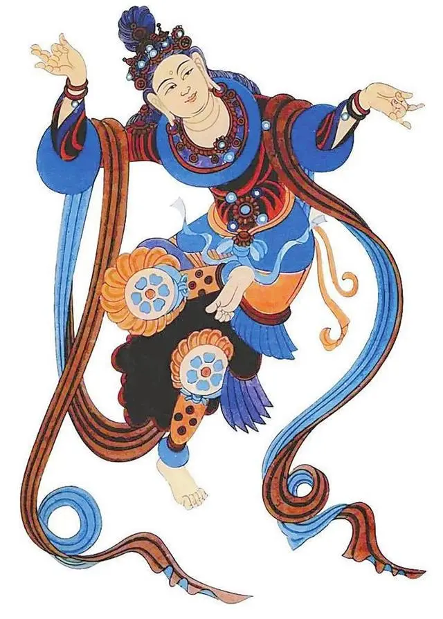 敦煌莫高窟,窟窟有壁画,拼接起来长达45000多平方米,有世界上“最大画廊”之称。这些壁画中,几乎每幅都有舞蹈形象,如在窟顶、龛楣、藻井遨游的飞天,凭栏上的天宫伎乐,经变画中的娱佛、敬佛的献舞者——伎乐天,出行图中跳着具有浓郁生活气息的世俗乐舞,以及富有舞蹈美感的彩塑菩萨、天王力士等,琳琅满目,精妙绝伦。这些舞蹈形象充分反映了从十六国北朝至元代千余年来不同历史时期的舞蹈服饰、形态、风貌,为我们挖掘、整理、弘扬中华民族舞蹈文化提供了十分珍贵的形象资料。